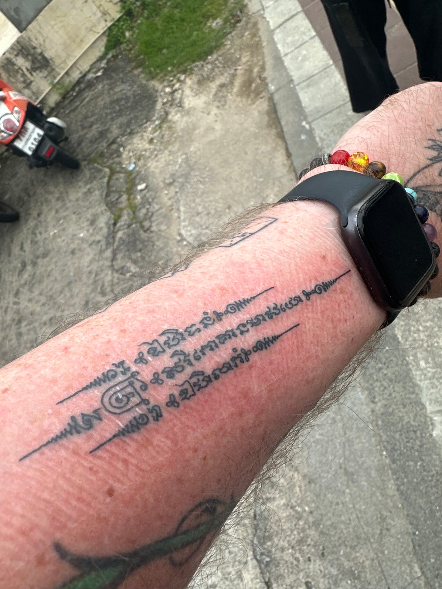 I got a Sak Yant-adjacent tattoo. Traditional Sak Yant is done by a trained Buddhist monks or spiritual masters known as Ajarns, and involves a blessing ceremony. But it also comes with guidelines, like not killing (sure!), not lying (uh…), and not getting heavily intoxicated (uh-oh).